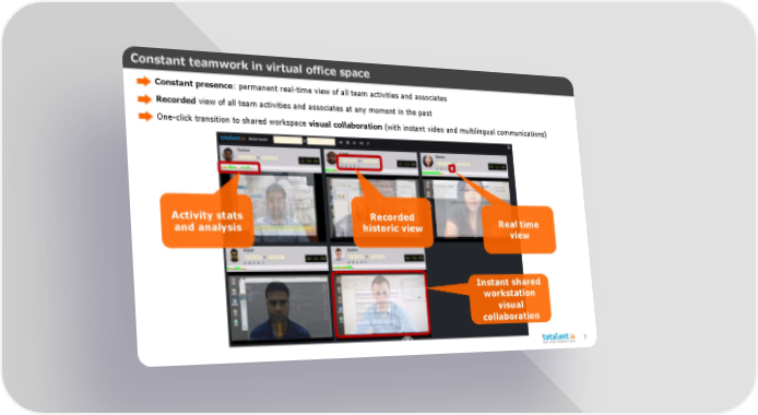 Constant teamwork in virtual office space Constant presence: permanent real-time view of all team activities and associates Recorded view of all team activities and associates at any moment in the past One-click transition to shared workspace visual collaboration (with instant video and multilingual communications) Activity stats Recorded Real time and analysis historic view view Instant shared workstation visual collaboration 7