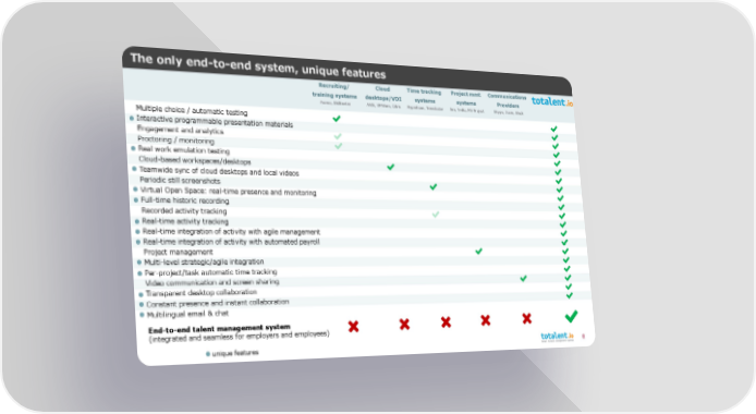 The only end-to-end system, unique features Recruiting/ Cloud Time tracking Project mmt Communications training systems desktops/VDI systems systems Providers Assess, Skillmeter AWS, VMWare, Citrix Hyperhour, Timedoctor Jira, Trello, MS Project Skype, Zoom, Slack Multiple choice / automatic testing Interactive programmable presentation materials Engagement and analytics Proctoring / monitoring Real work emulation testing Cloud-based workspaces/desktops Teamwide sync of cloud desktops and local videos Periodic still screenshots Virtual Open Space: real-time presence and monitoring Full-time historic recording Recorded activity tracking Real-time activity tracking Real-time integration of activity with agile management Real-time integration of activity with automated payroll Project management Multi-level strategic/agile integration Per-project/task automatic time tracking Video communication and screen sharing Transparent desktop collaboration Constant presence and instant collaboration Multilingual email & chat End-to-end talent management system (integrated and seamless for employers and employees) unique features 8