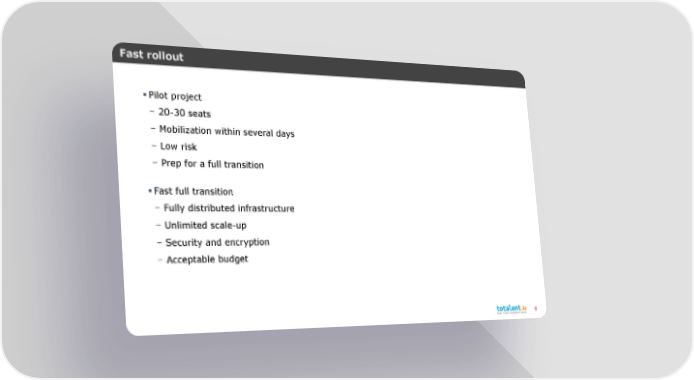 Fast rollout §Pilot project − 20-30 seats − Mobilization within several days − Low risk − Prep for a full transition §Fast full transition − Fully distributed infrastructure − Unlimited scale-up − Security and encryption − Acceptable budget 9
